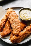 Two mozzarella sticks, two chicken fingers, two jalapeno poppers and onion rings.
